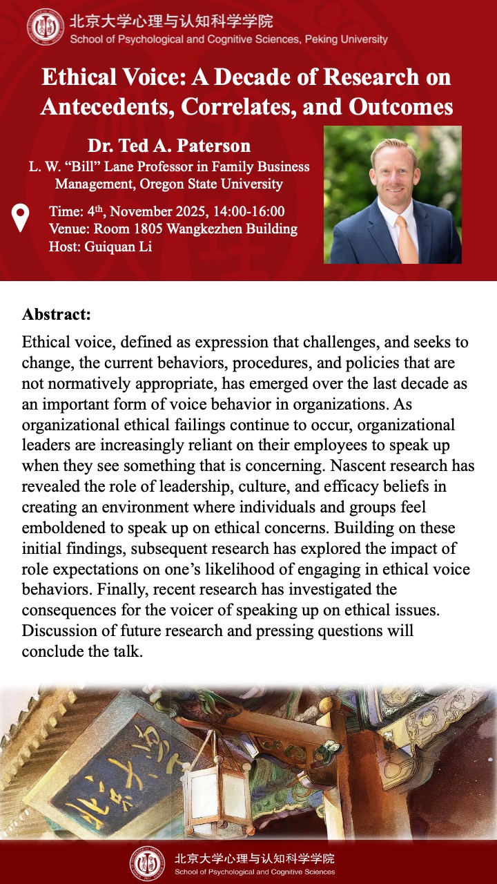 Ethical voice, defined as expression that challenges, and seeks to change, the current behaviors, procedures, and policies that are not normatively appropriate, has emerged over the last decade as an important form of voice behavior in organizations. As organizational ethical failings continue to occur, organizational leaders are increasingly reliant on their employees to speak up when they see something that is concerning. Nascent research has revealed the role of leadership, culture, and efficacy beliefs in creating an environment where individuals and groups feel emboldened to speak up on ethical concerns. Building on these initial findings, subsequent research has explored the impact of role expectations on one’s likelihood of engaging in ethical voice behaviors. Finally, recent research has investigated the consequences for the voicer of speaking up on ethical issues. Discussion of future research and pressing questions will conclude the talk.
